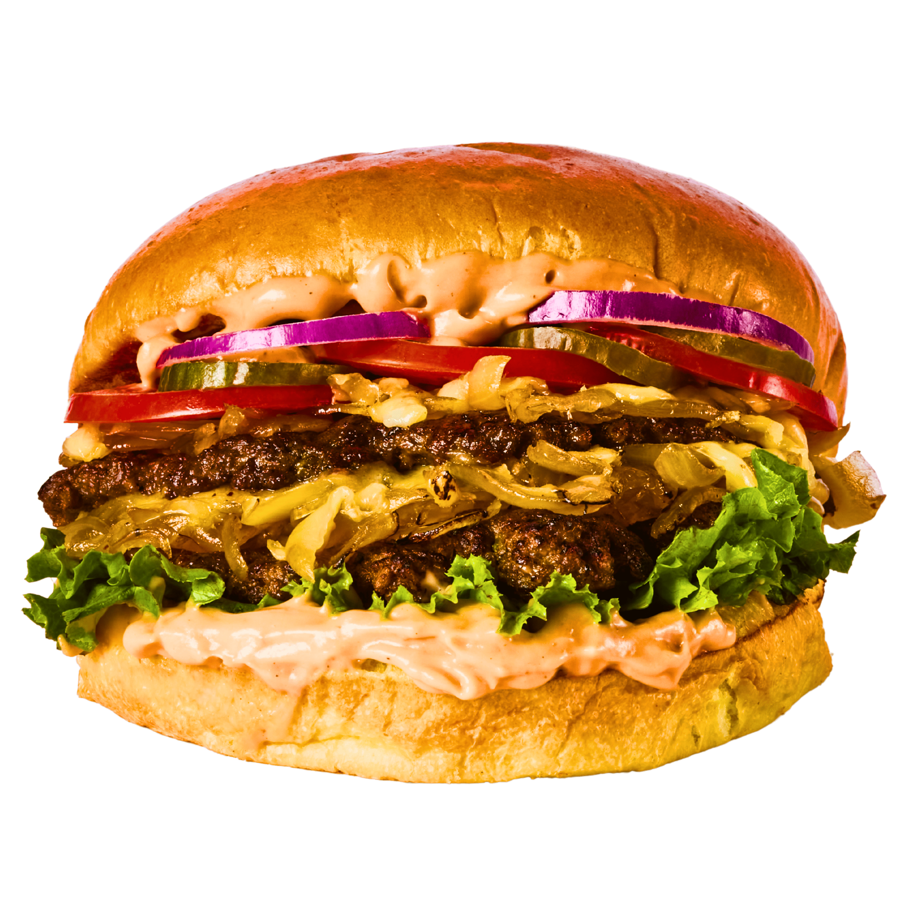 Smashed burger with mozzarella cheese, caramelized onions, and smoked BBQ dressing.