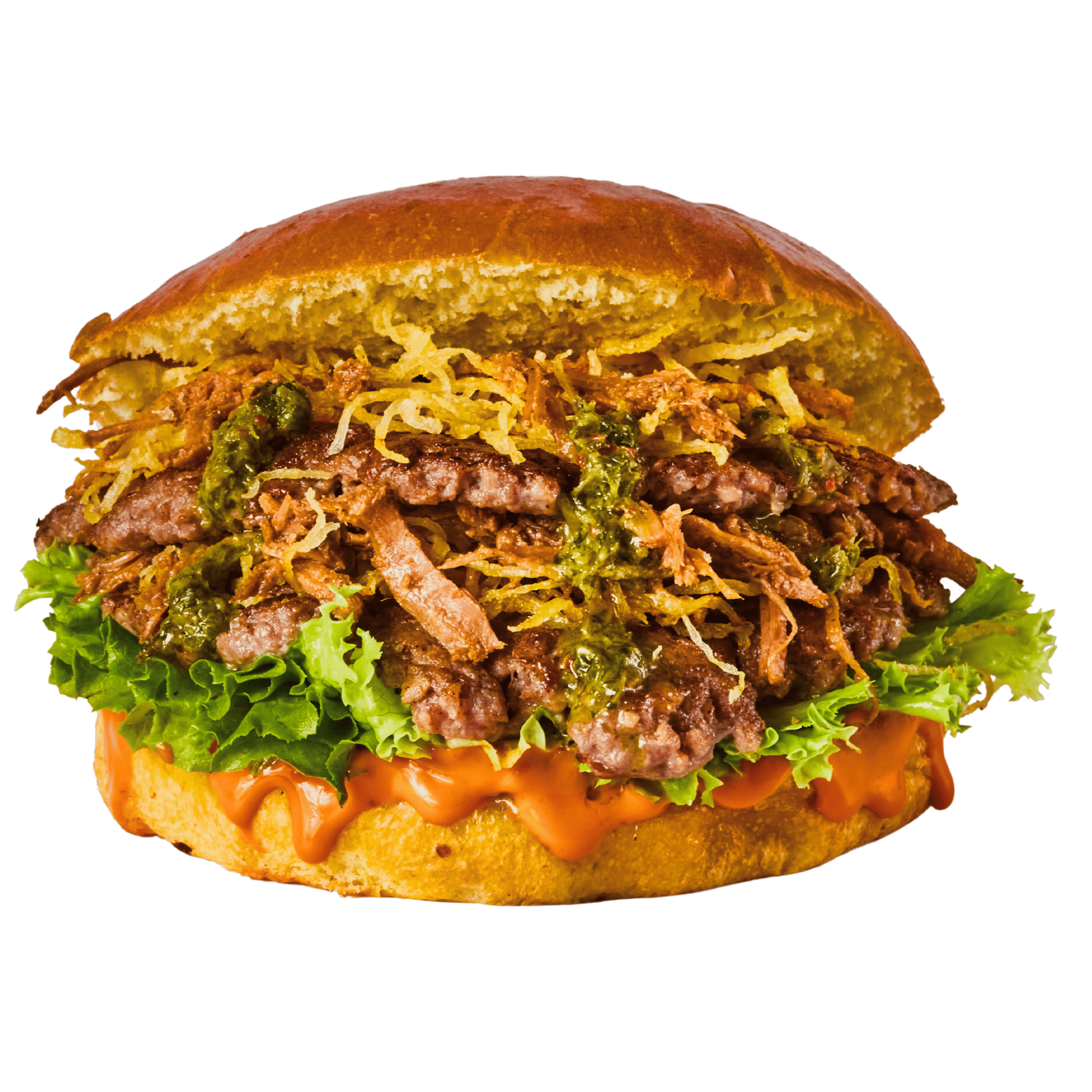 Smashed burger topped with beef brisket, chimichurri, Hank's dressing, and potato chips.