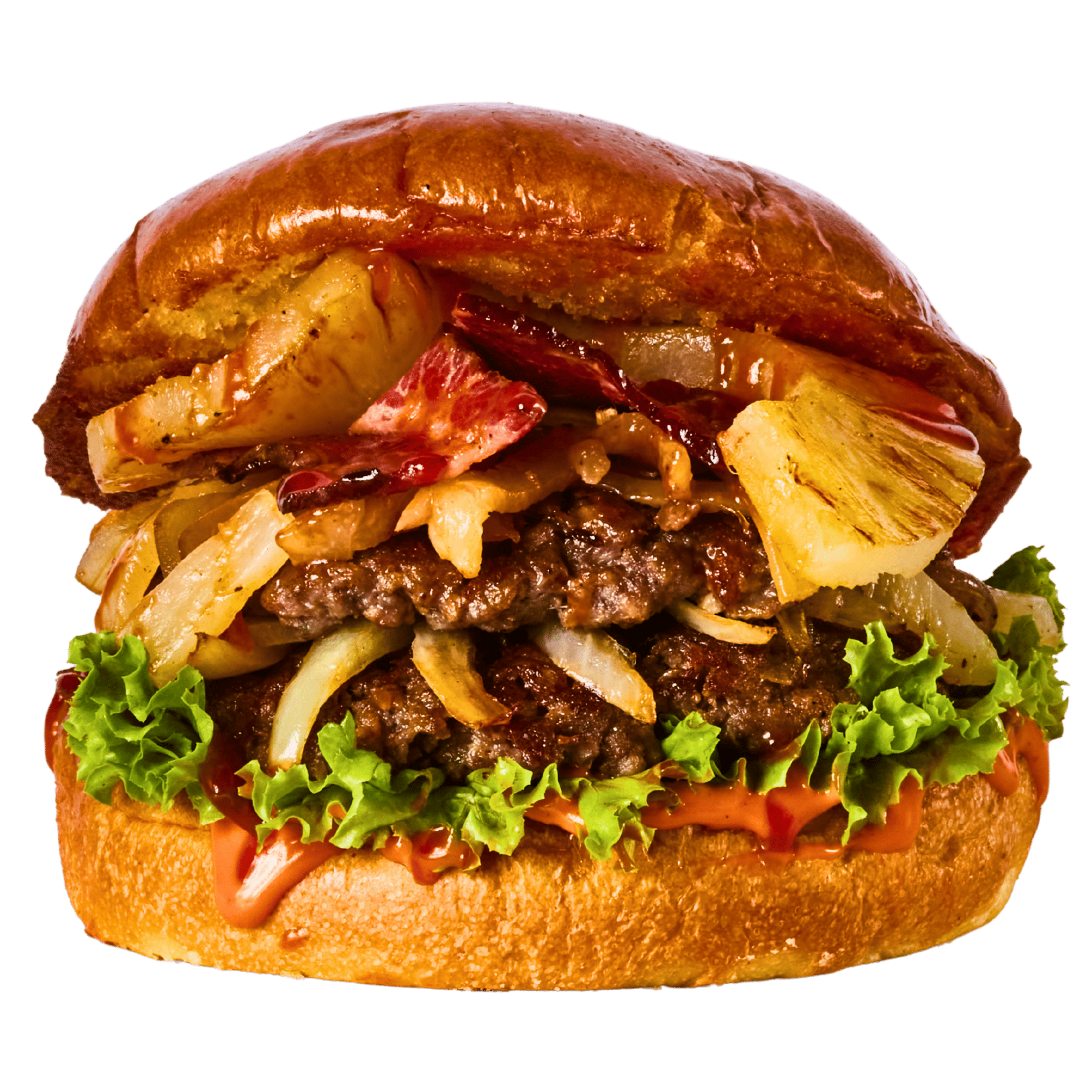 Smashed burger with Hank's dressing, pineapple slices, caramelized onions, beef bacon, and sriracha sauce.