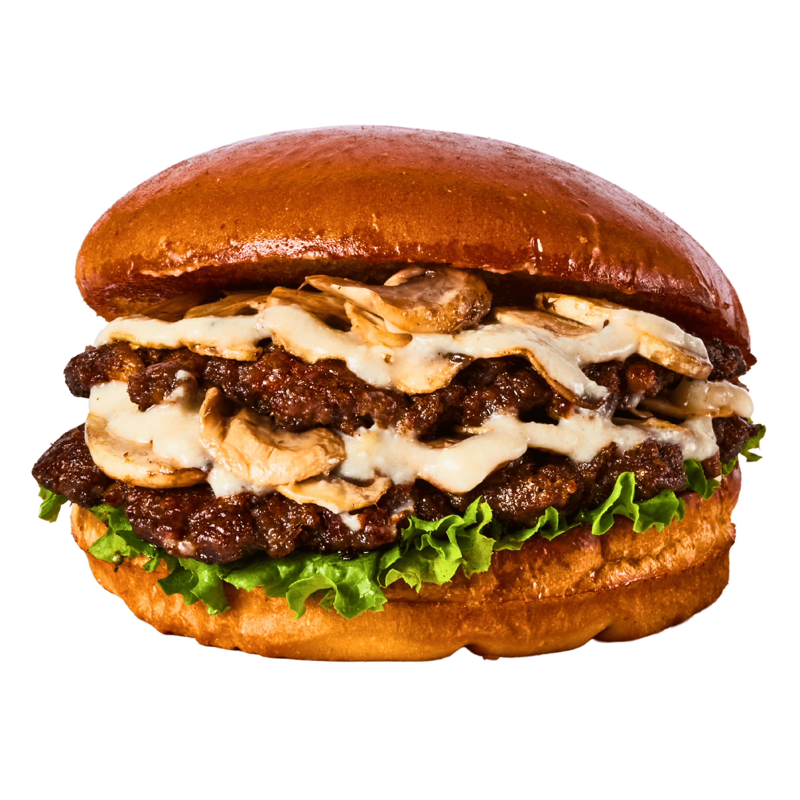 Smashed burger with fresh mushroom slices, white mushroom sauce, and lattuga