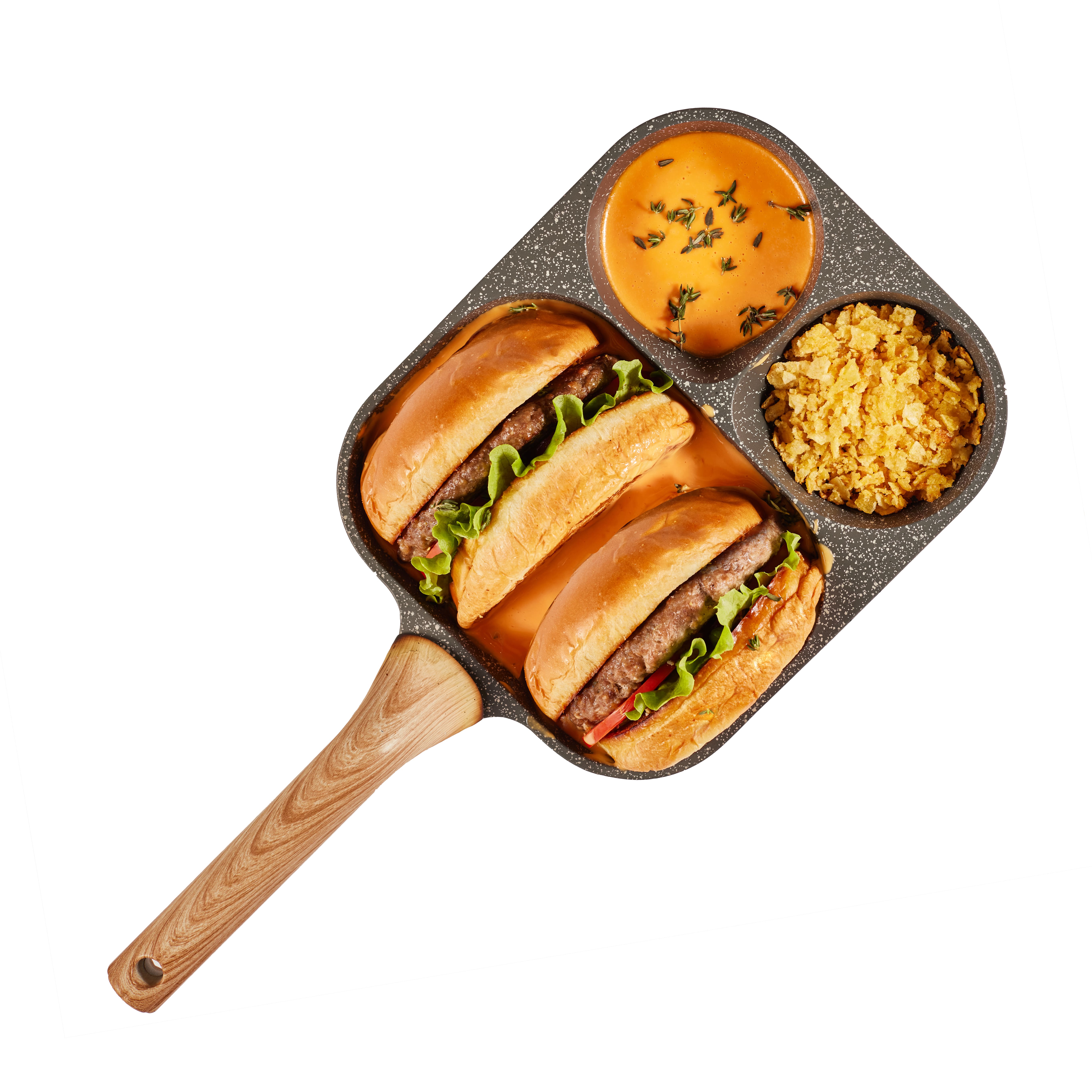 Classic burger on a skillet with melted cheese sauce and crispy flakes, so you can dip and bite.