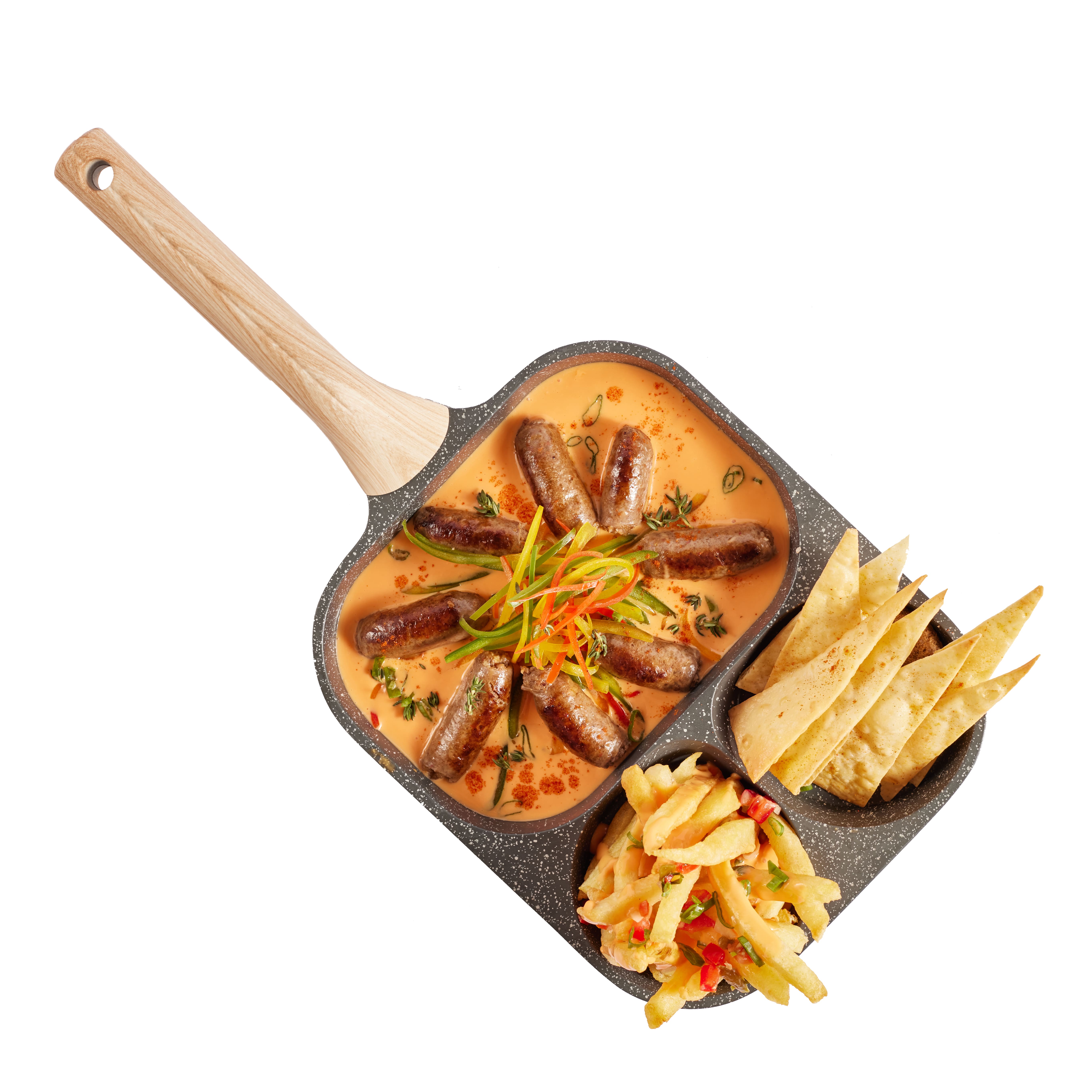 A cheesy pan with onions and coloured peppers, topped with our oriental sausage bites, with a side of our loaded fries and crispy tortilla bread.