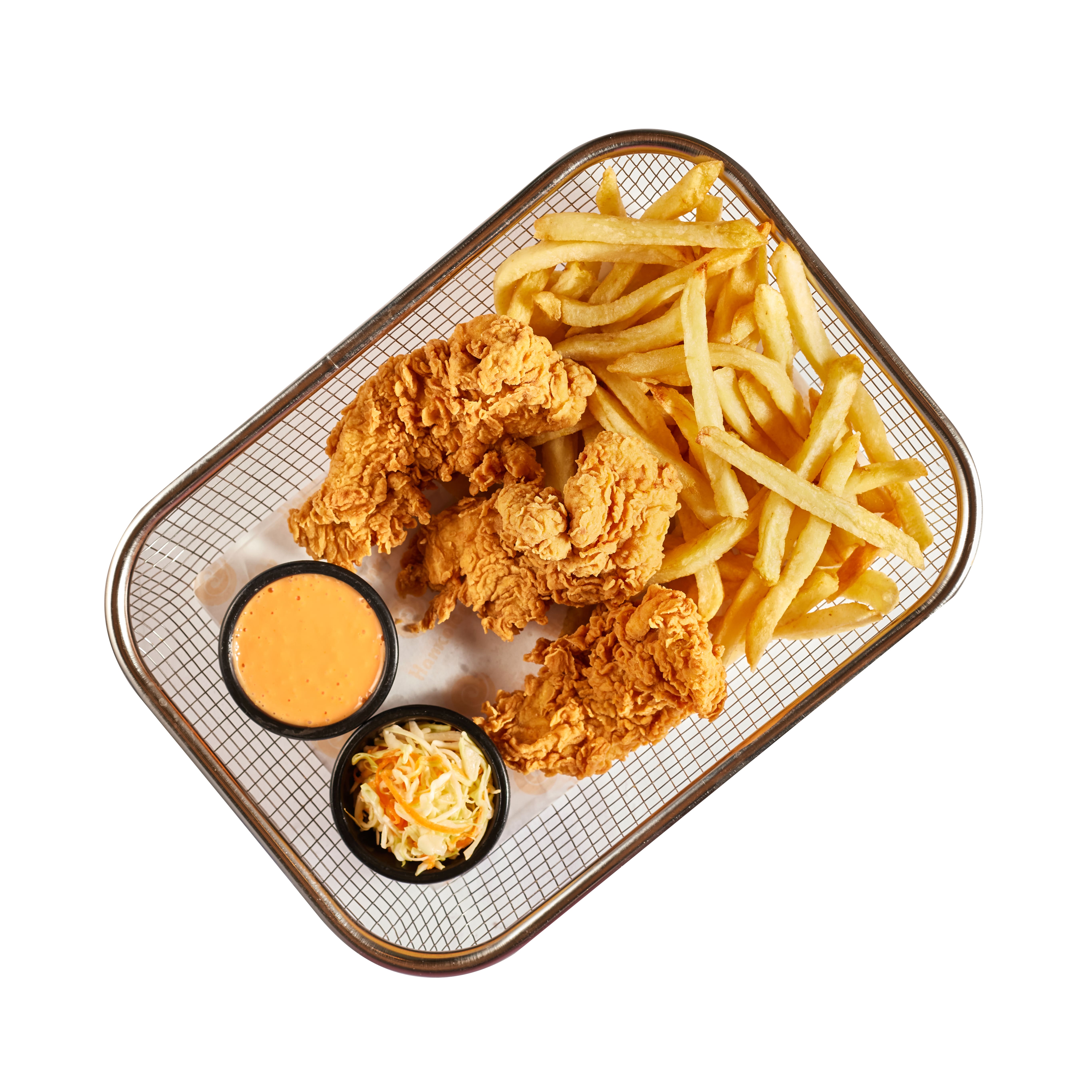 3 chicken tenders pieces coated with Hankology"s special marination served with our homemade fries, ketchup, cheddar sauce, and two mini brioche buns.