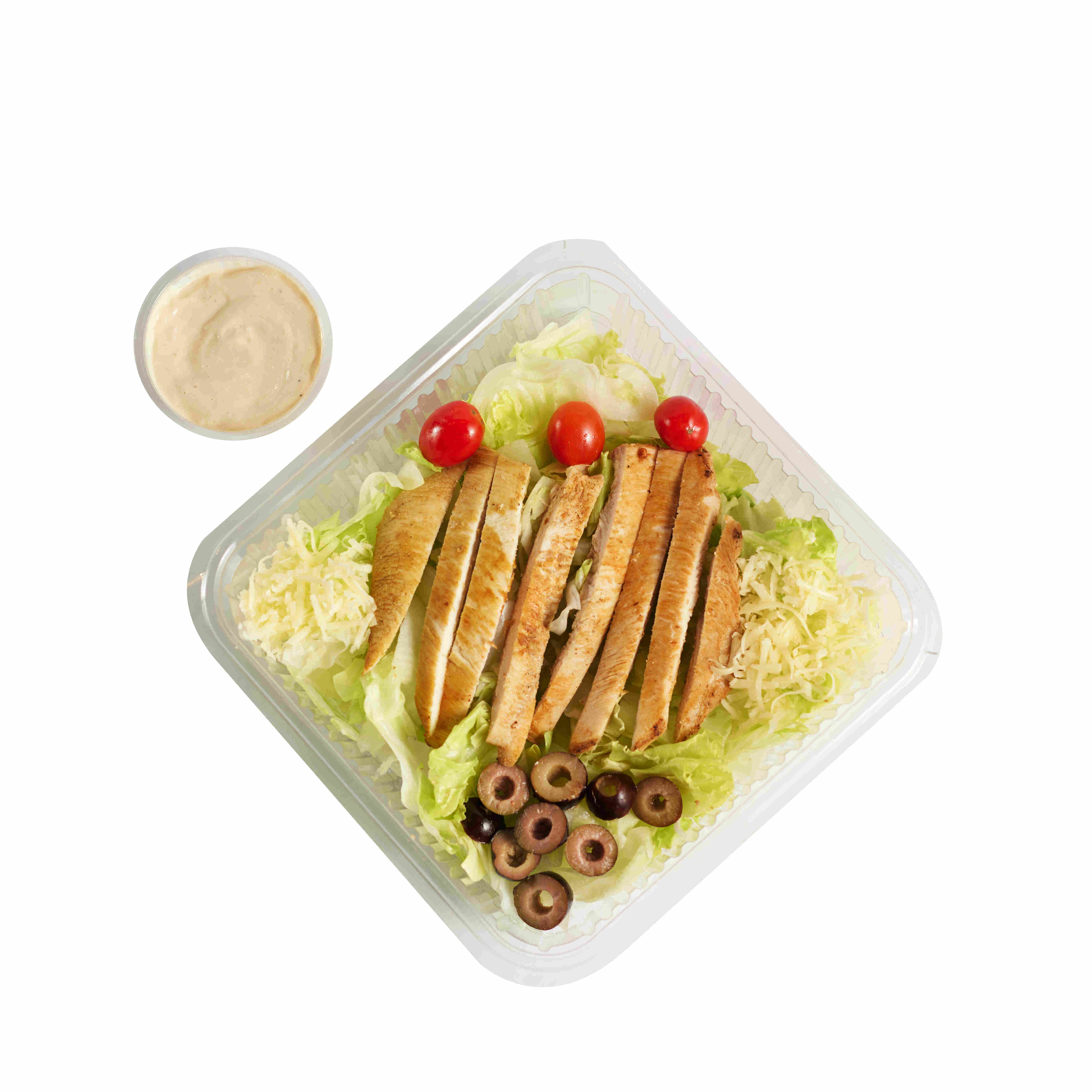 Ice berg lettuce, black olives, cherry tomato, parmesan cheese, grilled chicken, and Caesar dressing.