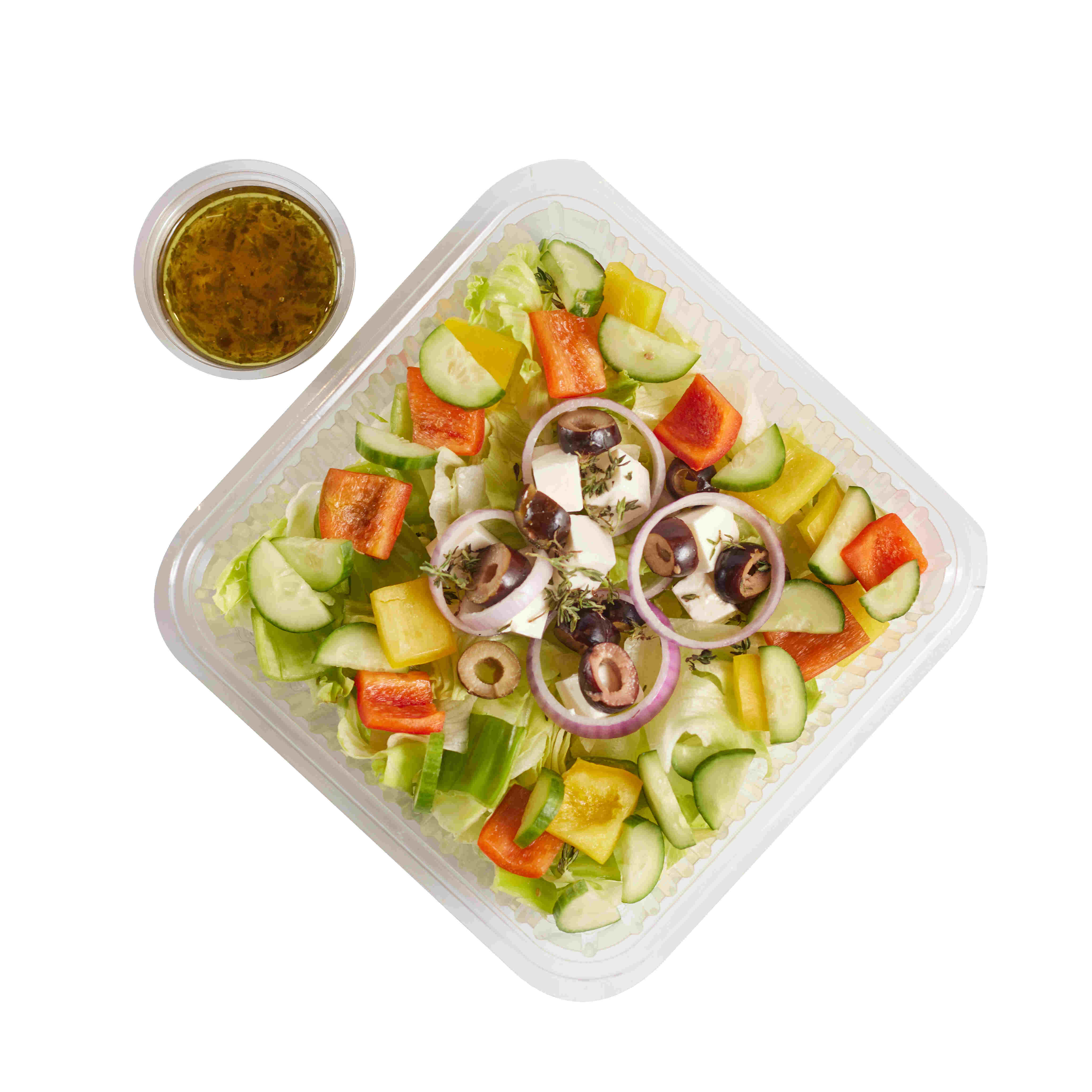 Ice berg lettuce, cherry tomato, coloured bell pepper, feta cheese, olives, cucumber, fresh onion, thyme, and Greek dressing.