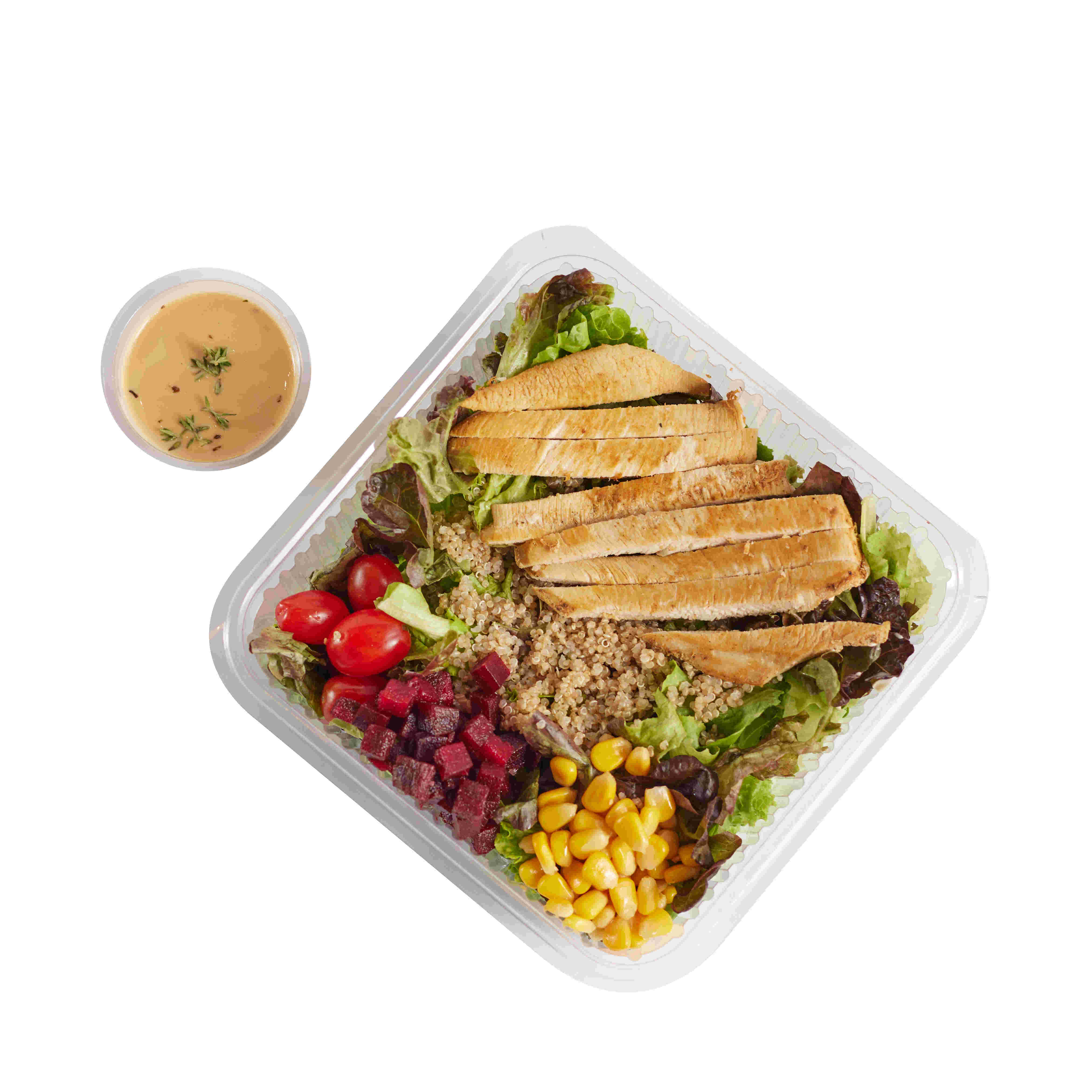 Red lettuce, sweet corn, cherry tomato, beetroot, grilled chicken, quinoa, and Quinoa dressing.